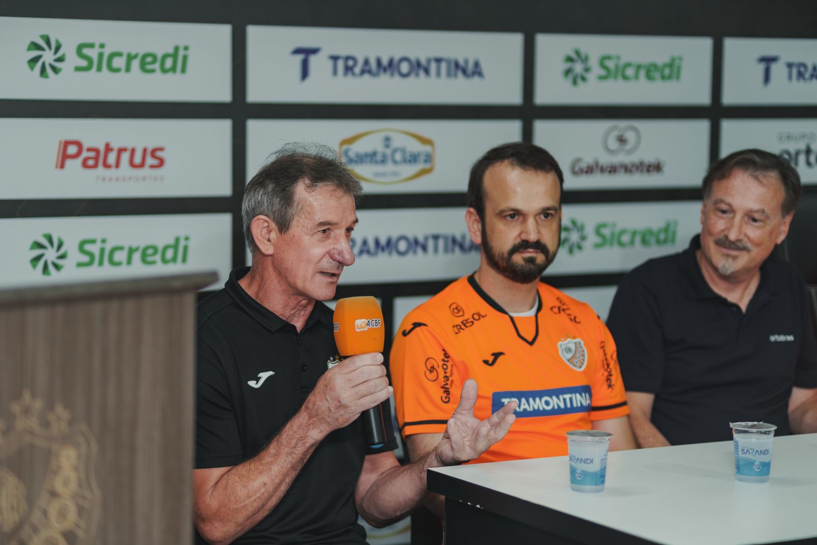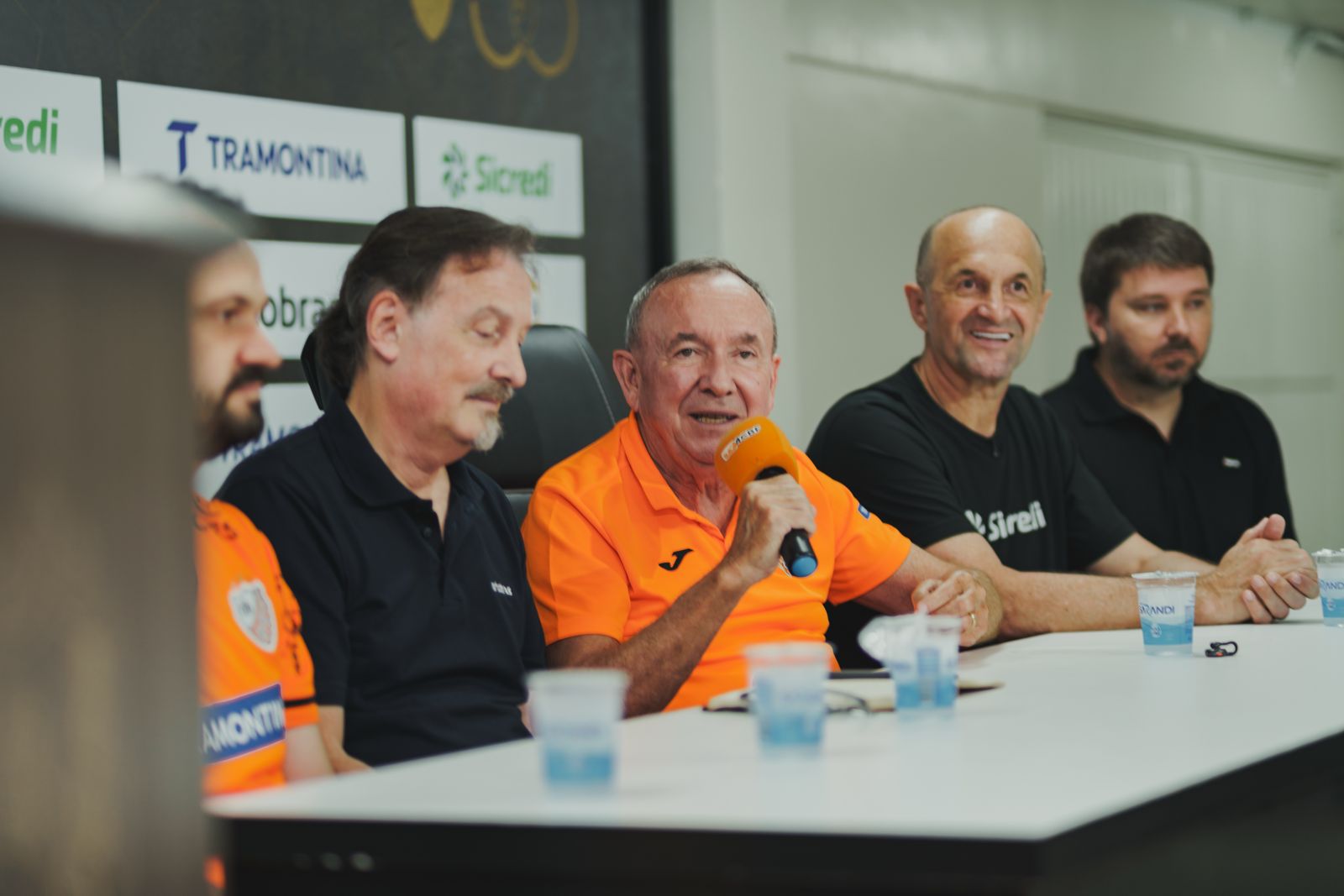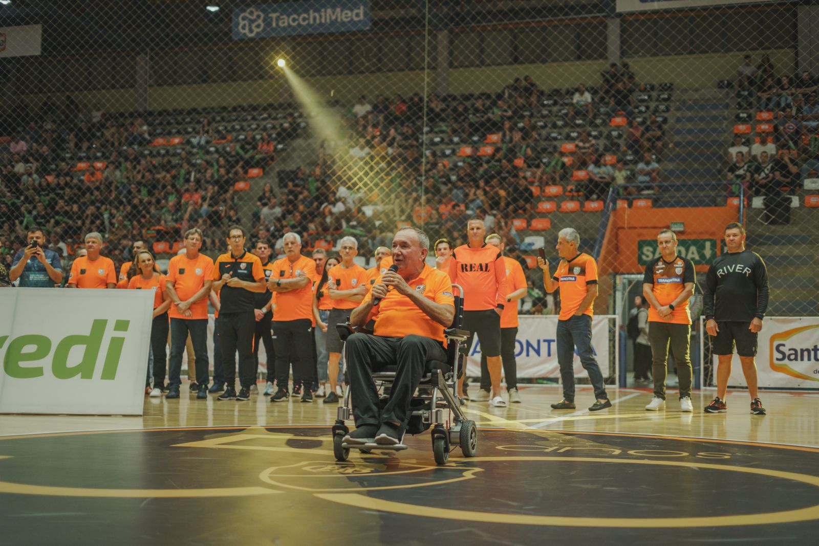 Em seguida, foram chamados ao centro da quadra o presidente Clovis Tramontina e o presidente do Conselho Deliberativo, Ildo Paludo. Tramontina, em pronunciamento emocionado, reforçou o legado das cinco décadas e a importância de honrar a história enquanto se constrói o futuro.