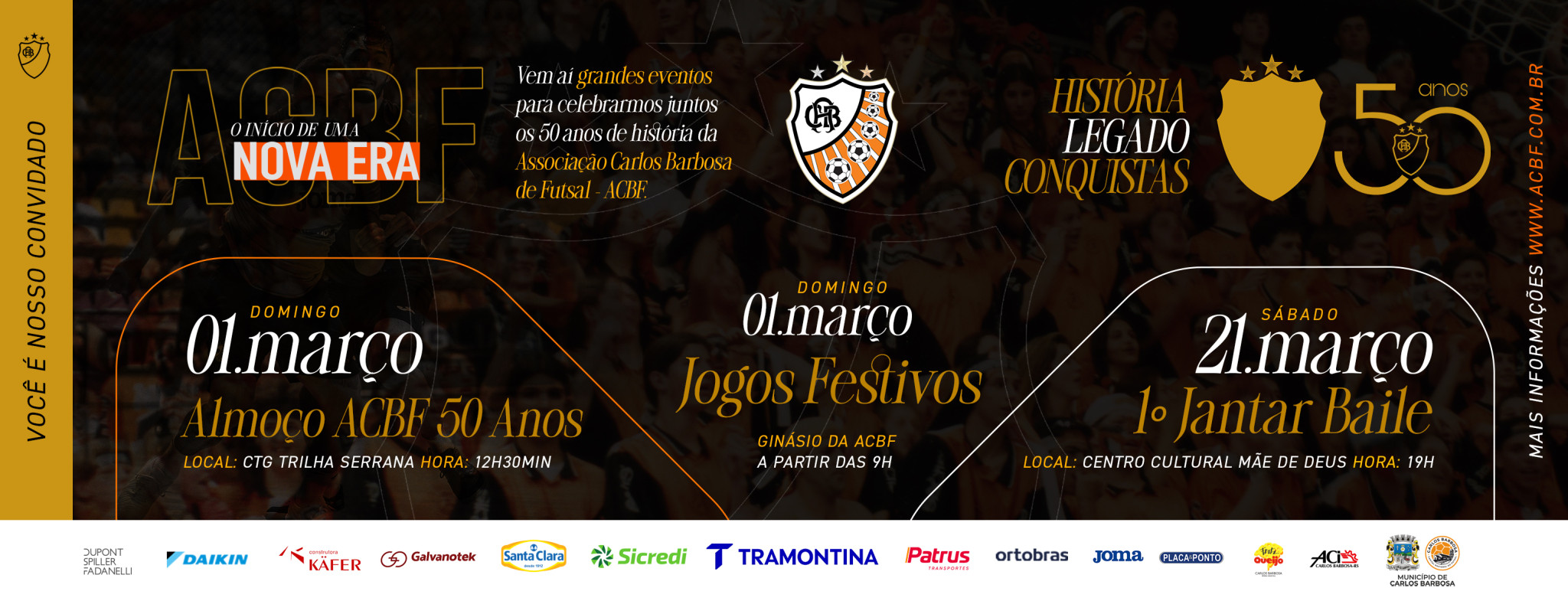 Os Patrocinadores Oficiais dos 50 Anos são parte essencial desta trajetória e estarão presentes em cada ação, cada vitrine, cada evento. Neste momento especial, a ACBF celebra e agradece a confiança de: